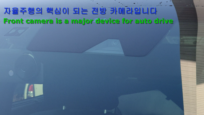 자율주행에 필요한 센서 중에 전방 차량과 장애물형태 그리고 차선을 인식하는 카메라입니다. 앞유리 윗부분에 하나가 장착되어 있습니다. 테슬라에는 6개 이상의 카메라가 장착되어 있는데 좀 적죠? 그레도 자율주행 웬만큼 하는 것을 보면 참 기특합니다. 아참. 사이드미러에 장착된 카메라 2대도 있군요..^^
