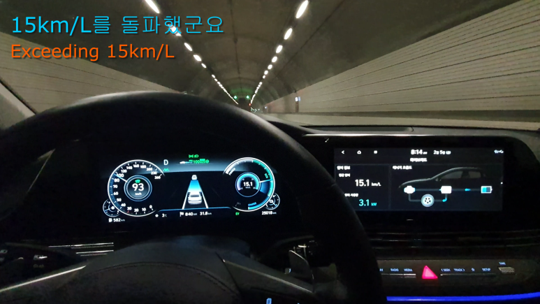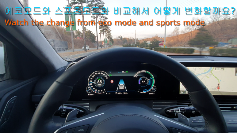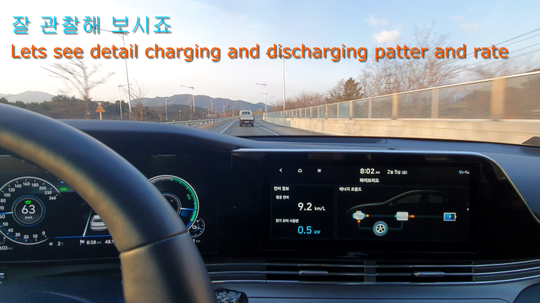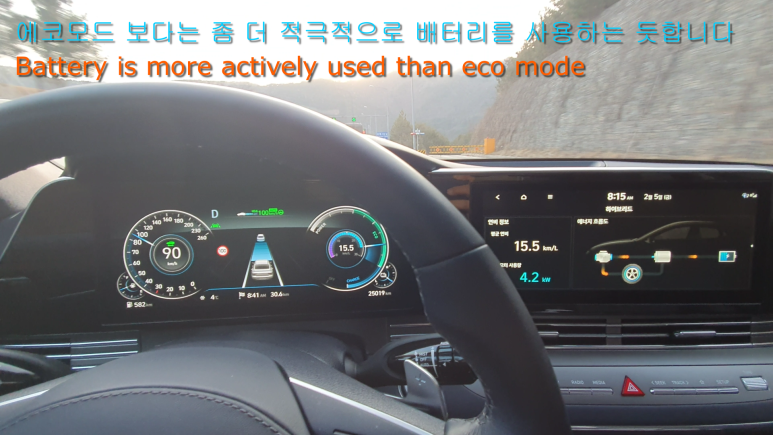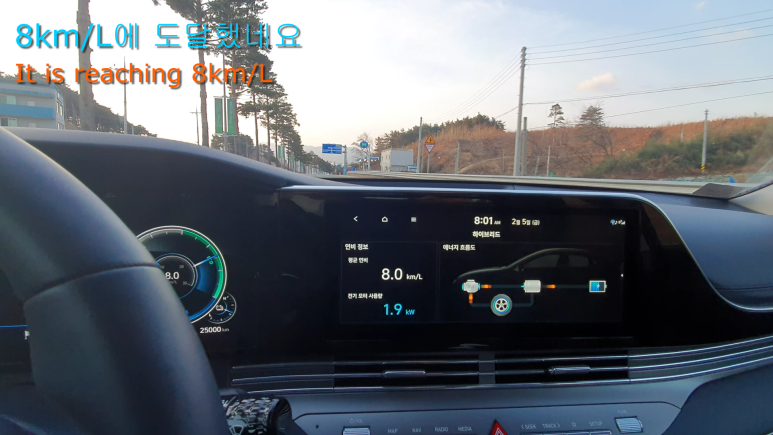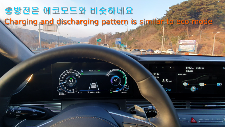 얼마 되지 않아 8킬로에 도달합니다. 에코모드에 가깝네요. 스포츠모드에서는 한참 동안 충전을 하다가 나중에 연비가 상승했는데, 컴포트 모드에서는 충전을 적극적으로 하기는 하지만 그래도 충전량이 아주 많지는 않습니다. 그레서 연비가 빠르게 상승하는 것 같습니다.