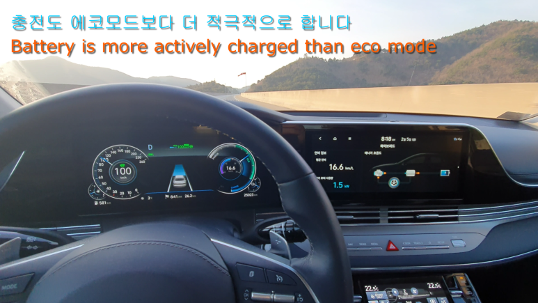 충반전 패턴은 이미 작성한 포스트를 참조하시면 스포츠모드와 에코모드때 어땠는지 알 수 있습니다. 핵심은 배터리 충전 량을 어느수준에서 유지하는 가 인 것 같습니다. 물론 충전 목표량에 도달하면 그때부터는 큰 차이가 없을 것 같구요